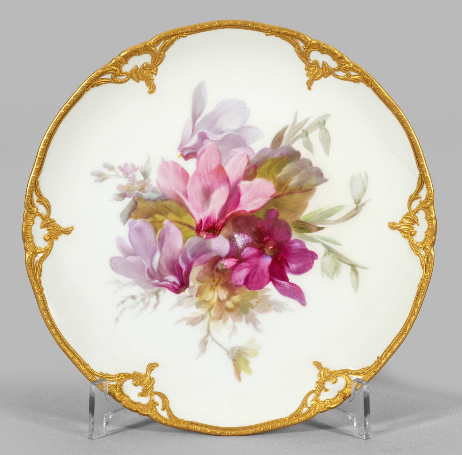 Runde, leicht vertiefte Form mit passig geschweiftem, reliefierten Rocaillerand aus Biskuitporzellan. Im Spiegel ein groß angelegtes, farbenprächtiges Arrangement aus blühenden Alpenveilchen in polychromer, feiner pastelltoniger Weichmalerei von Max Liebenau (geb. 1875, seit 1894 ausgebildeter Blumenmaler, bis 1931 in der KPM tätig). Dazu Dekormalerzeichen für Paul Rogge. Zepter- und Malereimarke. D. 22 cm.