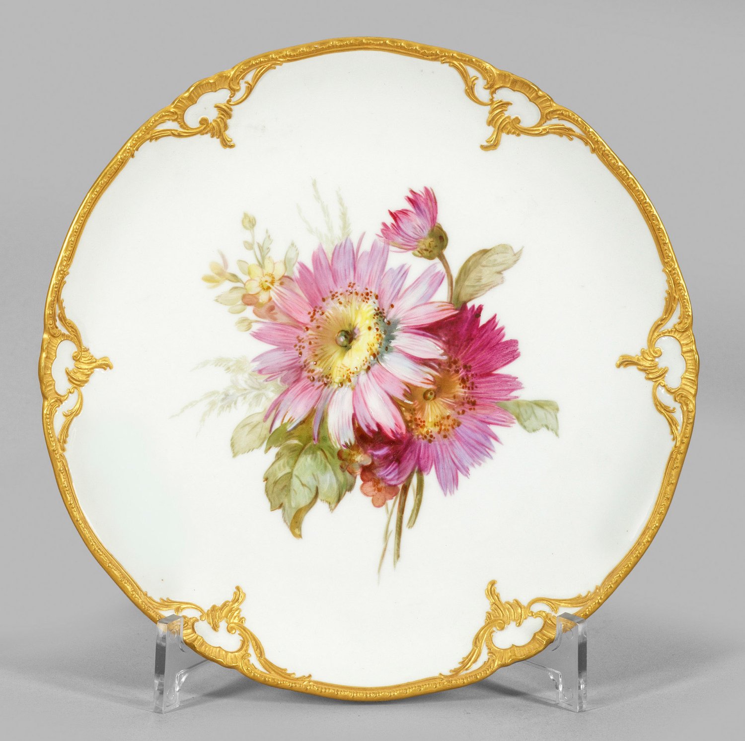 Runde, leicht vertiefte Form mit passig geschweiftem, reliefiertem Rocaillerand aus Biskuitporzellan. Im Spiegel ein Blütenzweig in polychromer, weichtoniger Malerei. Malerzeichen für Carl Peterwitz (geb. 1882, als Blumenmaler seit 1900 für die KPM tätig). Zepter- und Malereimarke. D. 22 cm.