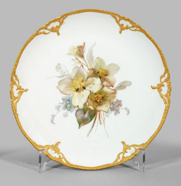 Runde, leicht vertiefte Form mit passig geschweiftem, reliefiertem Rocaillerand aus Biskuitporzellan. Im Spiegel Blütenzweige in polychromer, weichtoniger, teilw. weißgehöhter Malerei. Malerzeichen. Zepter- und Malereimarke. D. 22 cm.