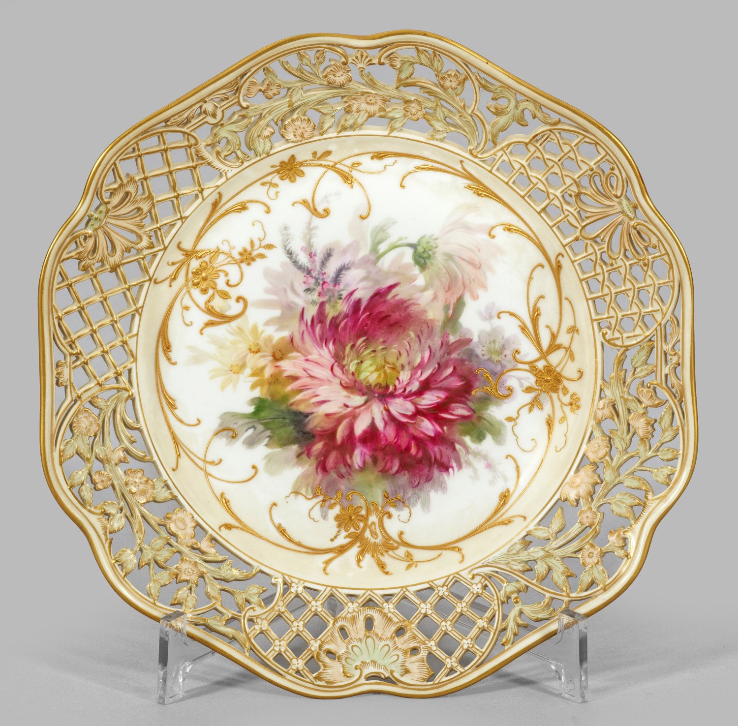 sog. "Pompadour-Form" mit passig geschweiftem Rand. Floral und mit Gitterwerk durchbrochen gearbeitete Fahne. Im leicht vertieften Spiegel ein großflächig angelegtes, dichtes Bukett mit blühenden Chrysanthemen in pastelltoniger, weiß gehöhter Weichmalerei umzogen von feinlinigem Ranken- und Gitterwerk aus Reliefgold. Zepter- und Malereimarke. D. 23,5 cm.