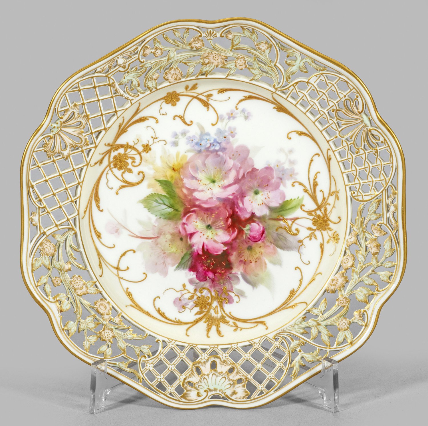 sog. "Pompadour-Form" mit passig geschweiftem Rand. Floral und mit Gitterwerk durchbrochen gearbeitete Fahne. Im leicht vertieften Spiegel ein großflächig angelegtes, farbenprächtiges Bukett mit blühenden Heckenrosen in pastelltoniger, weiß gehöhter Weichmalerei umzogen von feinlinigem Ranken- und Gitterwerk aus Reliefgold. Malerzeichen für Hermann Friedrich Ismer (geb. 1874, in der KPM seit 1893 fertig ausgebildeter Blumenmaler). Zepter- und Malereimarke. D. 23,5 cm.