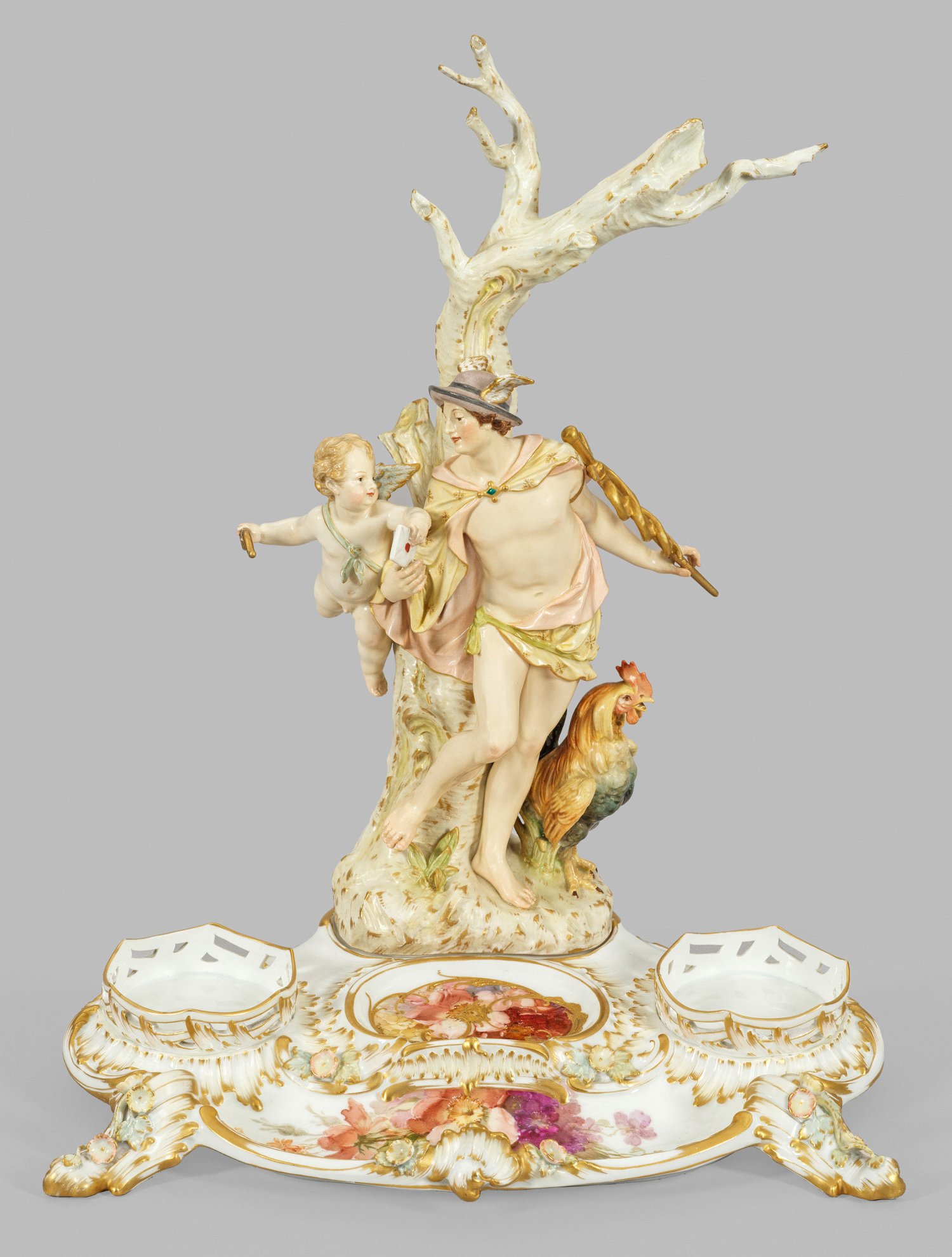 2-tlg., verschraubt. Von Blattfüßen mit reliefplastischer Blütenzier getragene, geschweifte, leicht vertiefte Schale mit abgegrenzten Ablagen sowie zwei durchbrochen gearbeiteten Einsätzen. Darin diffus sich ausbreitende Blütenarrangements, teilw. mit Reliefgoldrocaillen in sog. Weichmalerei. Zentral die figürliche Darstellung des an einem Baumstamm stehenden Götterboten Hermes, mit Flügelhelm und Heroldsstab aus zwei gewundenen Schlangen, einen eiligen Brief von dem heranfliegenden Amorknaben in Empfang nehmend. Seitlich am Boden ein Hahn. Figurengruppen-Entw. Friedrich Elias Meyer. Feine polychrome Malerei mit reicher Goldstaffage. Malerzeichen. Partiell rest.; Minim. best.; Zepter- und Malereimarke. H. 37,5 cm.