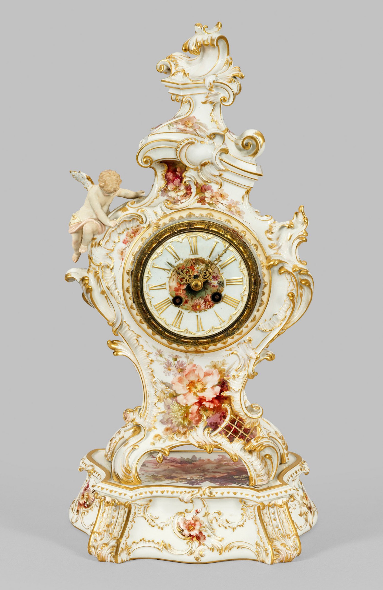 2-tlg.; Trapezförmig geschweifter Sockel mit pilasterförmig hervorkragender Gliederung und Akanthusblättern. Allseits rocailleförmig umzogene Reliefkartuschen. Auf vier Füßen stehender, balusterförmiger, stark geschweifter, durch Muschel- und Blattvoluten konturierter Korpus bekrönt von korrespondierend architektonischem Aufbau. Sich an die Schulter klammernde Figur eines vollplastischen Puttos. In den Freiflächen sowie im Spiegel des Sockels farbintensive Blumenbuketts und Blütenarrangements in zarttonig verlaufender, polychromer Weichmalerei mit Weißhöhungen von Karl Jung (tätig als Blumenmaler von 1888 bis 1896). Maler-Sign.; Dezente pastelltonige Farbfonds sowie reiche Goldstaffage. Form-Entw. Robert Schirmer, 1885. Modell-Nr. 3105. Mittig runde Verglasung mit Bronzefassung. Porzellanzifferblatt mit goldenen, römischen Zahlen. Zusatzstempel "Made in Germany". Minim. best./rest.; Uhrwerk besch.; Zepter- und Malereimarke. Ges.-H. 52,5 cm. Sockel 26 cm x 15 cm x 7,5 cm. Uhren-H. 45 cm.