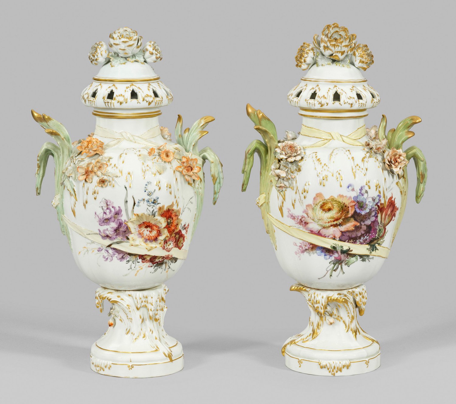 Eingezogener Rundfuß mit reliefplastischem Blattwerk und Blüten. Darüber balusterförmiger, von geknotetem Reliefband mit Schleife umzogener Vasenkorpus, in kurzen zylindrischen Hals übergehend. Aufgewölbter, durchbrochen gearbeiteter Haubendeckel, bekrönt von großen, feinplastisch gearbeiteten Pfingstrosen. Seitlich aufsteigende Schilfblattbüschel als Handhaben und plastische Blüten auf der Schulter. Beidseitig zentral der Wandung beinahe spiegelfüllende, farbenprächtige Blumenbuketts, in polychromer, teilw. weißgehöhter Weichmalerei. Zarte, pastelltonige Staffage mit Gold. Minim. rest./best.; Zepter- und Malereimarke. H. 43 cm - 44 cm.