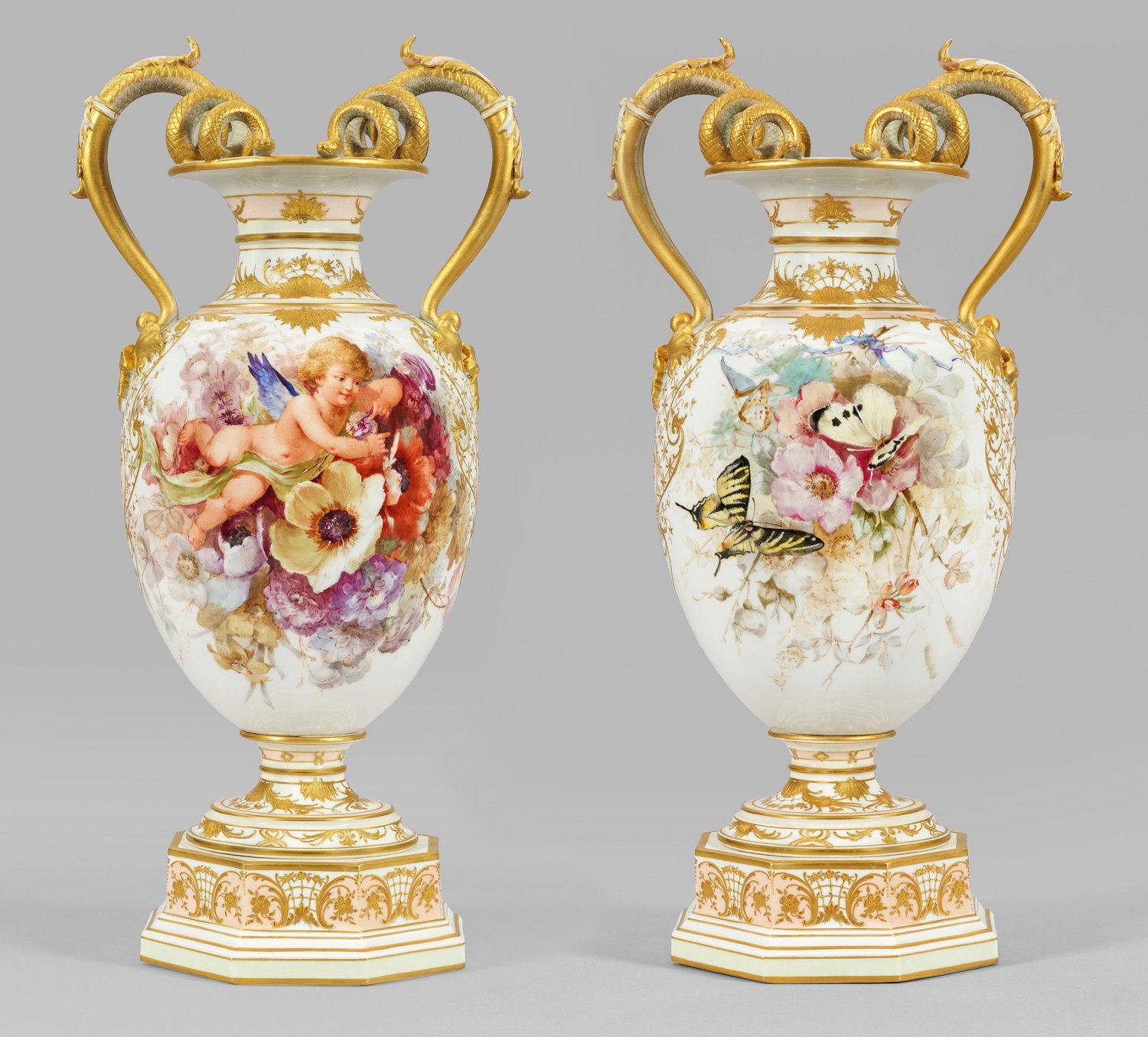 Über oktogonalem, getrepptem Postament mit rundem Fuß, ovoider Korpus mit gerundeter Schulter, in eingezogenen Hals und weit ausschwingenden Rand übergehend. Seitlich, über aufgelegtem Blattreliefansatz geschweift aufsteigende, reich vergoldete Handhaben in Gestalt eines, sich spiralförmig windenden Schlangenpaares. Schauseitig der Wandung großflächiges Arrangement mit Anemonen und in diesem Blütenmeer sich wonnender Amor mit Zweig. Rücks. weit verzweigende Heckenrosen mit einem Schwarm von Schmetterlingen. Virtuose, teilw. weißgehöhte, sog. Weichmalerei in farbenprächtiger, diffus verlaufender polychromer Malerei. Auf dem Fuß, seitlich der Henkel sowie auf Schulter und Hals feingliedrige, florale- und ornamentale Reliefgoldbordüren auf teilw. mintgrünem bzw. lachsfarbenem Fond. Form-Entw. Julius Wilhelm Mantel, 1855. Minim. rest.; Äußerst minim. best.; Zepter-, Adler- und Malereimarke. H. 48 cm.