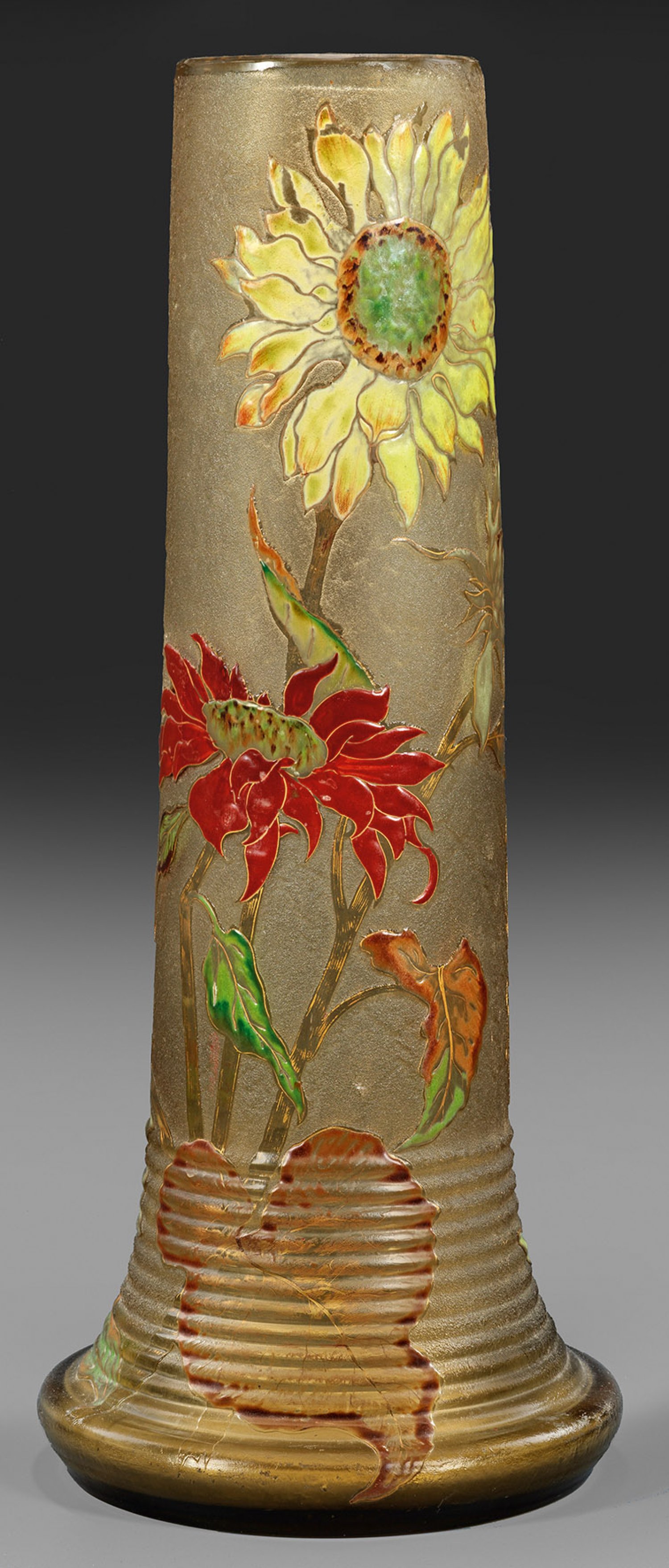 A large French Art Nouveau glass vase by Emile Gallé with acid-etched, enamel and gold decor of sunflowers (Helianthus). Signed.