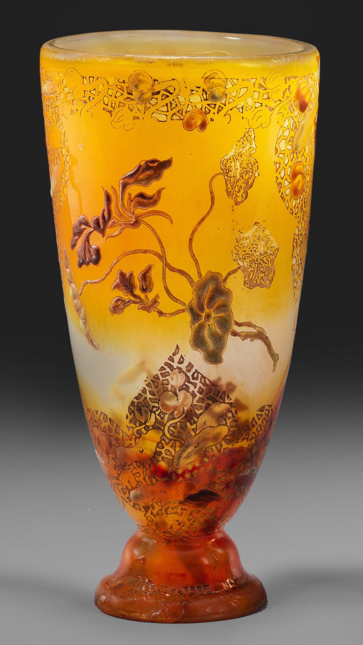 Auf glockenförmigem, geschweiftem, massivem Fuß spitzovoider, ins Oval gedrückter, sich zur Mündung weitender Korpus. Überfangglas, farblos, milchigweiß opalisierend, gelbe und karneolfarbene, marmorierte und fleckig gescheckte Einschmelzungen. Geätzter Dekor kombiniert mit farbiger, opaker Emailmalerei aus stilisierten Ornamenten und floralen Motiven. An einer Fußseite zum Rand geklebt. Nadelgeätzte Sign. am Boden "Cristallerie de Gallé Nancy" mit stilisierter Blüte und Blatt. H. 18,8 cm.
