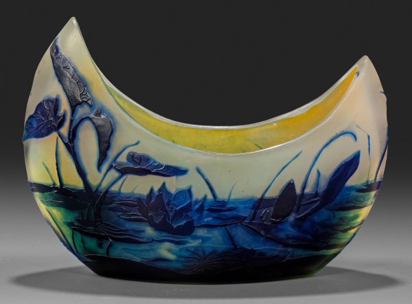 Leicht gebauchte Form mit hochgezogenem Bug und Heck. Überfangglas, farblos, gelb und dunkelblau. In mehreren Arbeitsgängen geätzter und polierter Dekor aus einer Teichlandschaft mit Seerosen und Pfeilkraut vor mattem Grund. Sign. "Gallé". H. 12,5 cm; B. 17,5 cm.