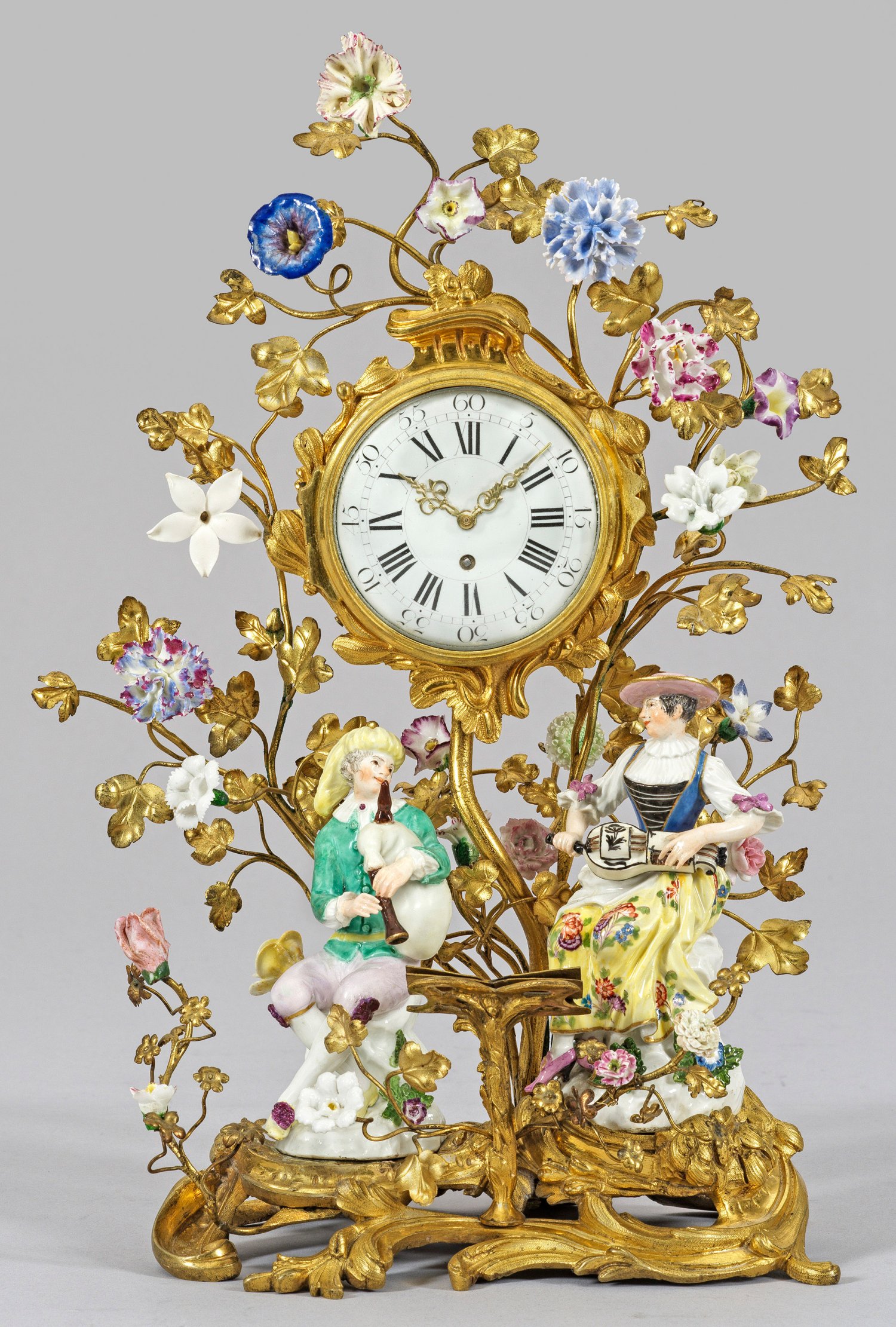 Von stark reliefplastisch gearbeiteten Blattvoluten getragene, vergoldete Bronzemontierung. Mittig zwei Einlassungen für die vor einem Notenpult stehenden Figuren. Auf felsiger, mit Blättern und Blüten belegter Anhöhe sitzender, junger Harlekin mit Dudelsack. Als Gegenstück junge Tirolerin (bzw. Columbine) in sommerlicher Tracht, eine Drehleier spielend. Rücks. aufsteigende Äste mit filigran geformten, farblich staffierten sog. Vincennes-Blüten aus Porzellan. Zentral rundes, verglastes Uhrengehäuse. Emailziffernblatt mit römischen Zahlen. Erg. mechanisches Werk mit Handaufzug. Polychrome Malerei mit Goldkonturierung. Entw. Johann Joachim Kaendler. Unw. rest./best.; Schwertertmarke. Figuren-H. 12,5 cm - 13 cm. Ges.-H. 37,5 cm.