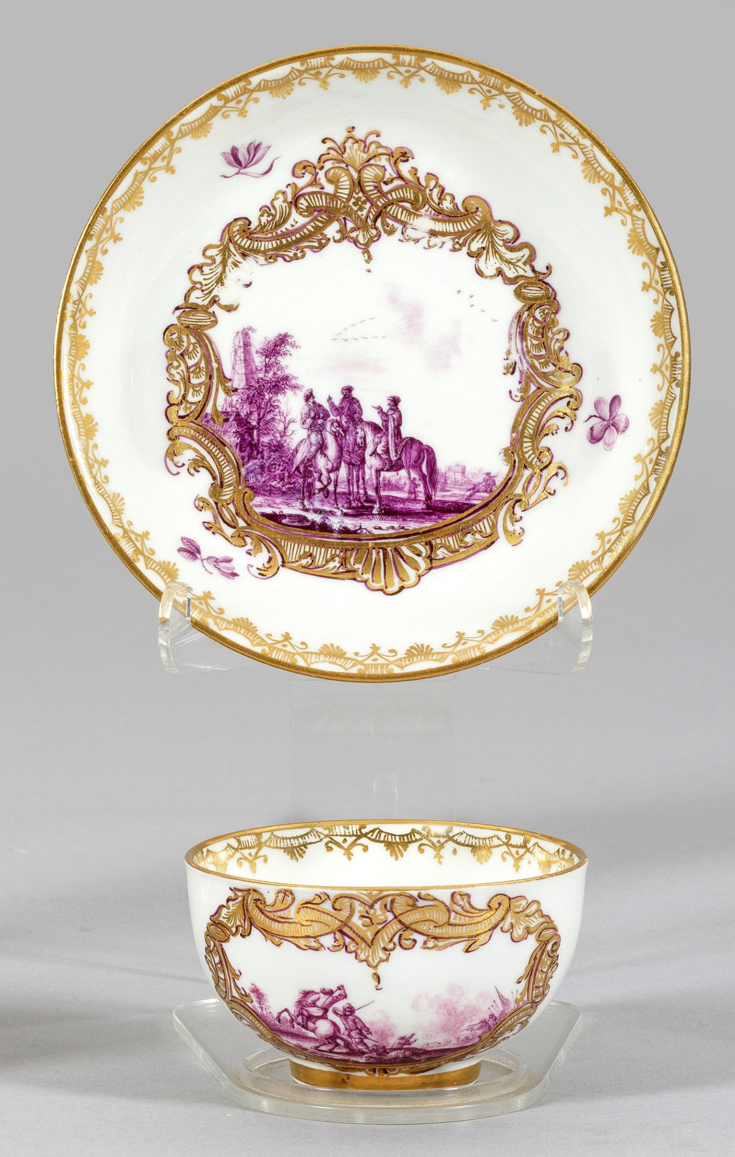mit Untertasse. Über dem Rundstand kugelig gedrückte Form mit Ohrenhenkel. Schauseitig der Wandung und im Spiegel goldornamentierte, vierpassige Kartuschenrahmung aus Laub- und Gitterwerk. Darin szenische Darstellung einer Schlacht mit Reitern im schweren Gefecht bzw. Reitern zu Pferde, nach Vorlage von Georg Philipp Rugendas. Gestreute Blüten. Feine Purpur-Camaieumalerei wohl von Johann Georg Heintze, Christian Friedrich Kühnel oder Philipp Ernst Schindler Sen.; Goldstaffage und Goldspitzenbordüre. Vergolder-Nr. 16; Schwertermarke. H. 4,5 cm. D. 13 cm.