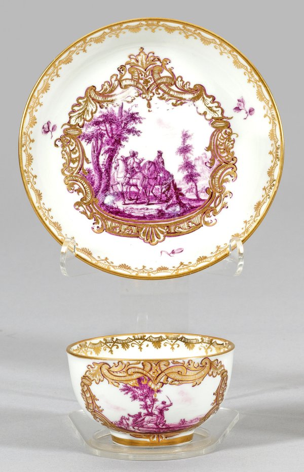 mit Untertasse. Über dem Rundstand kugelig gedrückte Form mit Ohrenhenkel. Schauseitig der Wandung und im Spiegel goldornamentierte, vierpassige Kartuschenrahmung aus Laub- und Gitterwerk. Darin verschiedene szenische Reiterdarstellungen im Kontext einer Schlacht, darunter eine Streifenpatrouille von Panduren. Letztere Szene nach der Radierung von Georg Conrad Bodenehr nach Georg Philipp Rugendas, aus der Serie Reiter und Gefechte (Augsburg, Grafische Slg. Inv. LG 4607-67c). Gestreute Blüten. Feine Purpur-Camaieumalerei wohl von Johann Georg Heintze, Christian Friedrich Kühnel oder Philipp Ernst Schindler Sen.; Goldstaffage und Goldspitzenbordüre. Vergolder-Nr. 16; Teilw. Pressziffer "2" für Christoph Schumann. Minim. ber.; Schwertermarke. H. 4,5 cm. D. 13 cm.