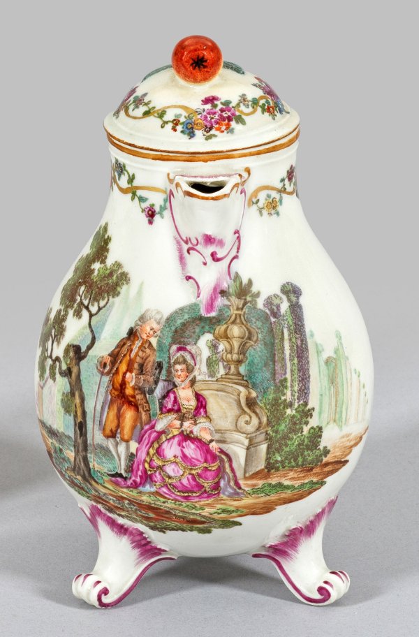 Auf drei ausgestellten Volutenfüßen birnförmiger Korpus. Rocaillehenkel sowie Schnabelausguss. Passig aufgewölbter Deckel mit plastischer Birnbekrönung. Schauseitig der Wandung Parklandschaft mit galantem Paar vor einer Steinbank. Oberhalb und auf dem Deckel umlaufende Blütenbordüre. Polychrome Malerei. Unw. rest.; Manufakturmarke. H. 17 cm.