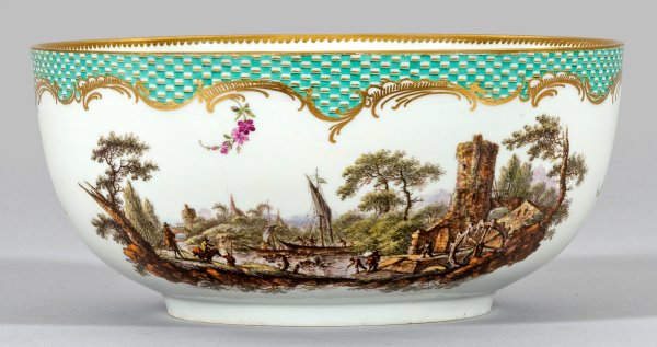 Über dem Rundstand halbkugelig gewölbter Korpus. Beidseitig der Wandung breite figurenreiche, architekturbestandene Szenen am Hafen- und Flussufer mit Segelbooten, Arbeitern und Reitern in weiter niederländisch anmutender Landschaft. Oberhalb rocaillegerahmte Schuppenbordüre. Blumengebinde verstreut auf der Wandung und im Boden. Polychrome Malerei mit Goldstaffage. Unw. ber.; Schwertermarke. H. 10 cm. D. 22 cm.