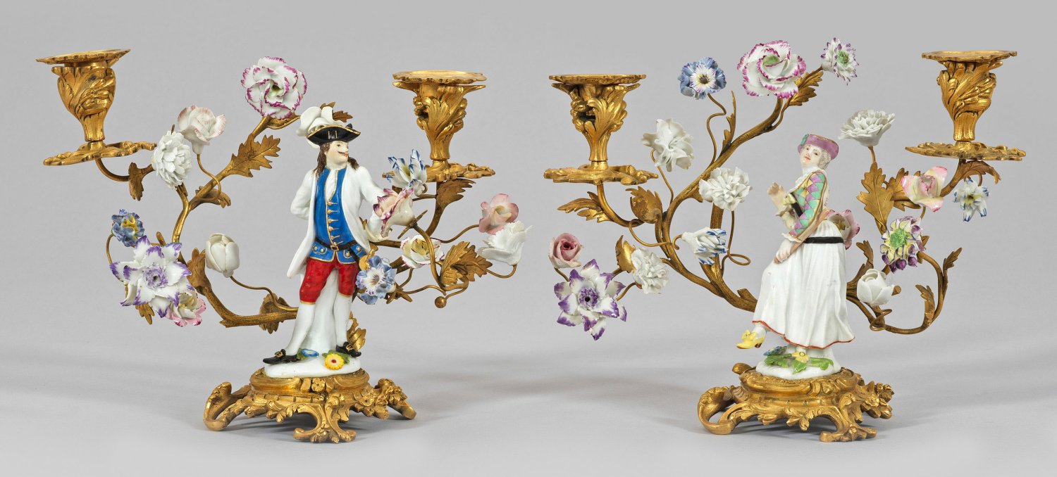 A pair of French gilt-bronze mounted candlesticks arranged with Meissen porcelain figures of Capitano and Columbine from the Commedia dell'arte for Johann Adolf II, Duke of Sachsen-Weißenfels and with Vincennes flowers. Partly restored. Minor chipped.
