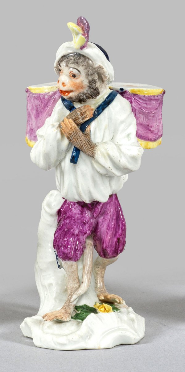 Auf rocaillereliefiertem, mit plastischer Blume und Blättern belegtem Sockel an einem Baumstumpf stehender Affe, zwei Pauken auf dem Rücken tragend. Polychrome Malerei. Entw. Johann Joachim Kaendler und Peter Reinicke. Minim. rest./best.; H. 13,5 cm.