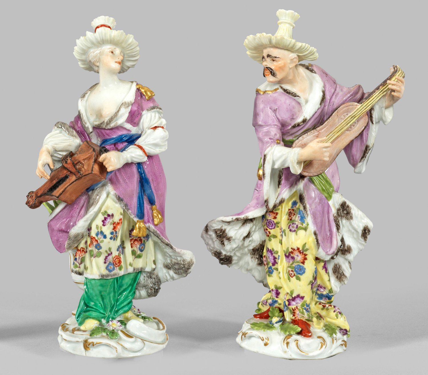 als Gegenstücke. Auf rocaillereliefiertem Sockel stehende, Drehleier spielende Malabarin in rosafarbenem, mit Hermelin gefüttertem Mantel, blumig gemustertem Unterkleid und einem Strohhut. Das Gegenstück eine Mandoline spielender Malabare im pelzgefütterten Mantel. Polychrome Malerei mit Goldstaffage. Entw. Friedrich Elias Meyer. Rest.; Partiell best.; Teilw. Schwertermarke. H. 17 cm - 18 cm.