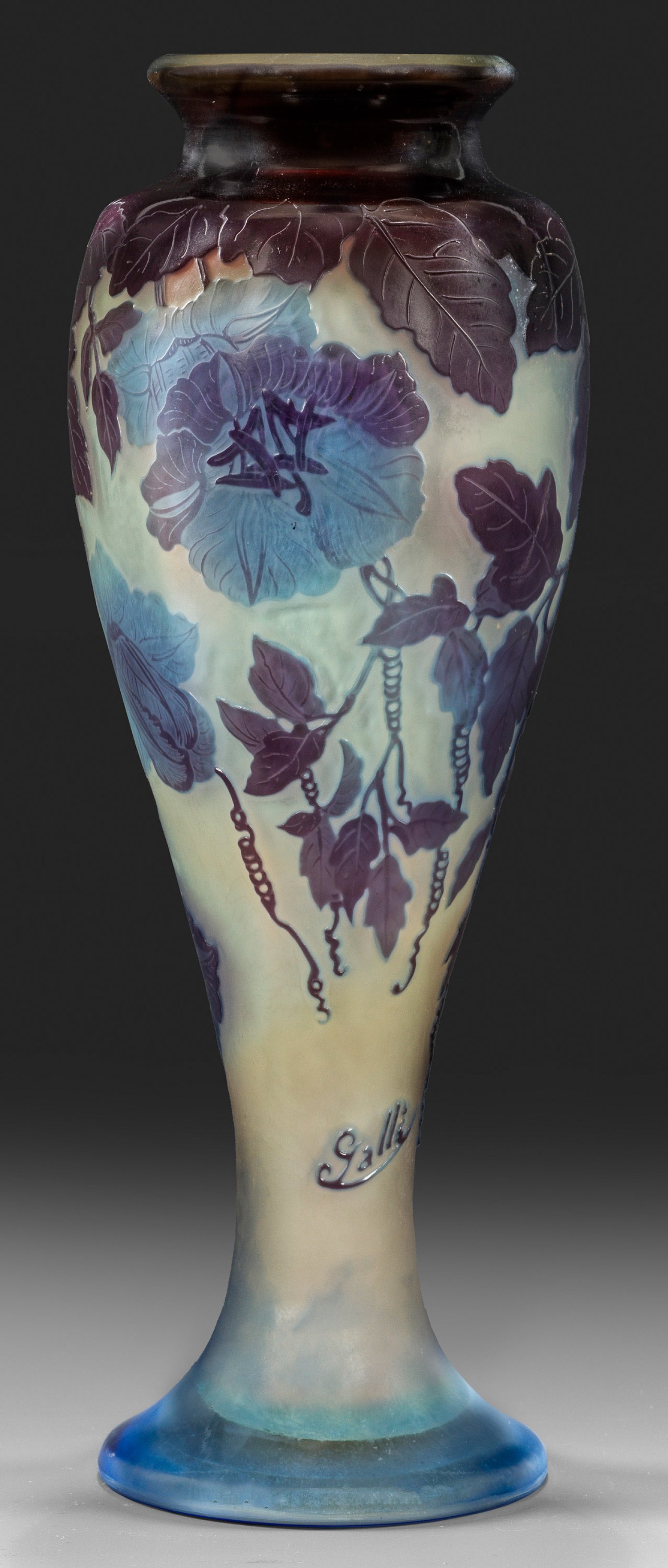 Schlanke Balusterform mit ausschwingendem Fuß, keulenförmigem Korpus, kurzem Hals und auslippendem Rand. Überfangglas, farblos, bernsteingelb, hellblau und violett. In mehreren Arbeitsgängen geätzter und polierter Dekor aus blühenden Bignonia-Ranken. Sign. "Gallé". H. 30,2 cm.