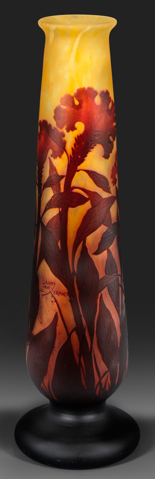 Hohe, gefußte Keulenform. Überfangglas, farblos, gelbe und rote Pulvereinschmelzungen, dunkelvioletter Überfang. Geätzter Dekor aus blühenden Hahnenkamm-Stängeln (Celosia argentea var. cristata) im sich stark verfärbenden Licht der untergehenden Abendsonne. Sign. "DAUM NANCY" in Verbindung mit Lothringer Kreuz, sowie "FRANCE". H. 54 cm.