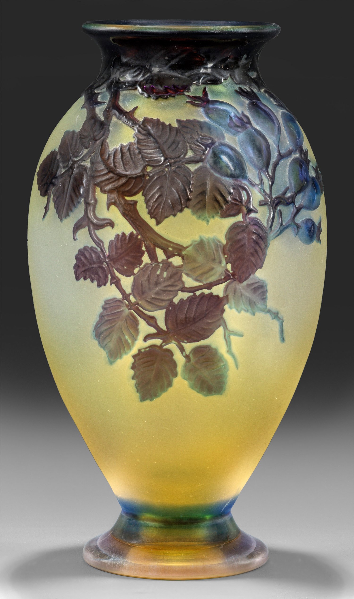 Balusterform mit ausgestelltem Fuß, spitzovoidem Korpus, leicht verengter Mündung und ausschwingendem Rand. Überfangglas, farblos, bernsteinfarben, hellblau opalisierend und violett. Reliefplastischer, in Soufflé-Technik ausgeführter, im Modell eingearbeiteter, polierter Dekor aus Wildrosenranken mit reifen Hagebutten vor matt ausgeätztem Grund. Sign. "Gallé". H. 24,5 cm.