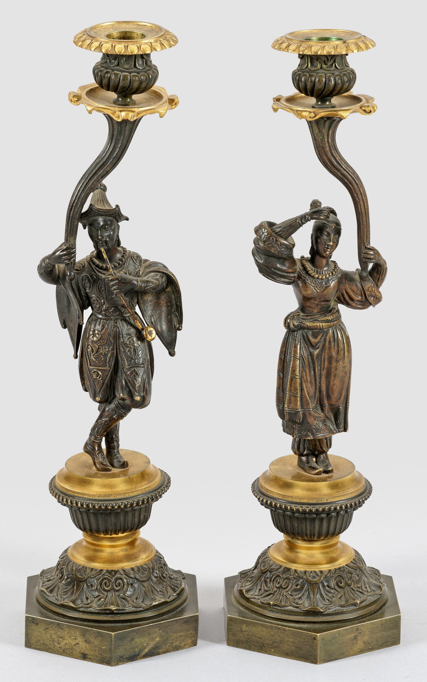 Gegenstücke. 1-flg.; Bronze, dunkel patiniert. Über gekanteter Basis blattreliefierter Balustersockel. Oberhalb vollplastische Darstellung eines Chinesen bzw. einer Chinesin als Träger für Leuchtmittel aus gestrecktem Füllhorn und godronierter Vasentülle. H. 36 cm.