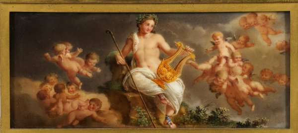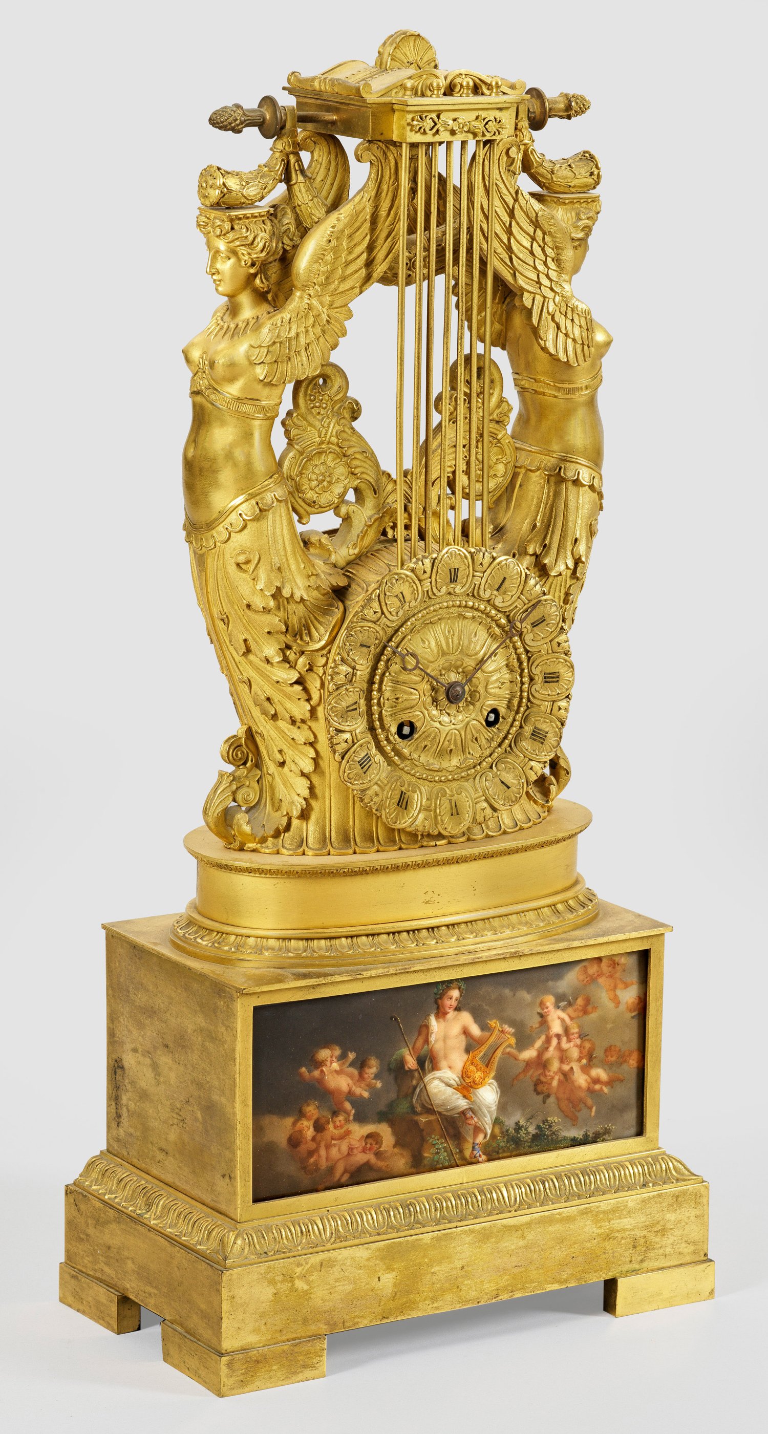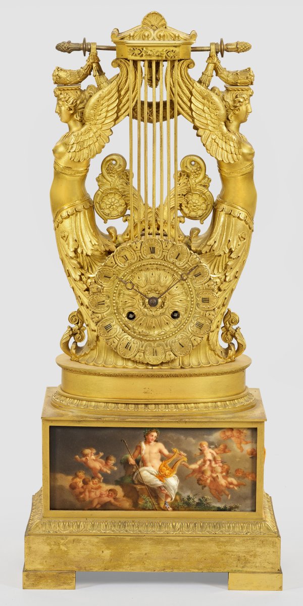 Bronze, vergoldet sowie polychrom bemalte Porzellanplakette. Querrechteckig angelegter, gestuft ansteigender Podestsockel mit Palmettenfries. In der Front eingelassene Reserve mit der Darstellung des jungen Apolls mit Lyra, umgeben von einem Schwarm aus Puttenkindern. Oberhalb lyraförmiger Korpus aus vollplastisch gestalten Genien und Festonmotiven. Reliefiertes Zifferblatt. Pendulenwerk mit Fadenaufhängung sowie Halbstundenschlag. Pendel und Glocke fehlen. H. 56 cm. 25,5 cm x 14 cm.