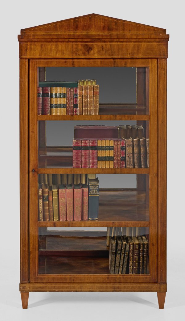 Mahagoni, furniert sowie Fadeneinlagen aus Ahorn. Gerader, hochrechteckiger, dreiseitig verglaster Korpus auf konischen Vierkantbeinen. In der Front große Vitrinentür. Breiter oberer Abschluss mit flachem Giebel. H. 173 cm. 84,5 cm x 41 cm.