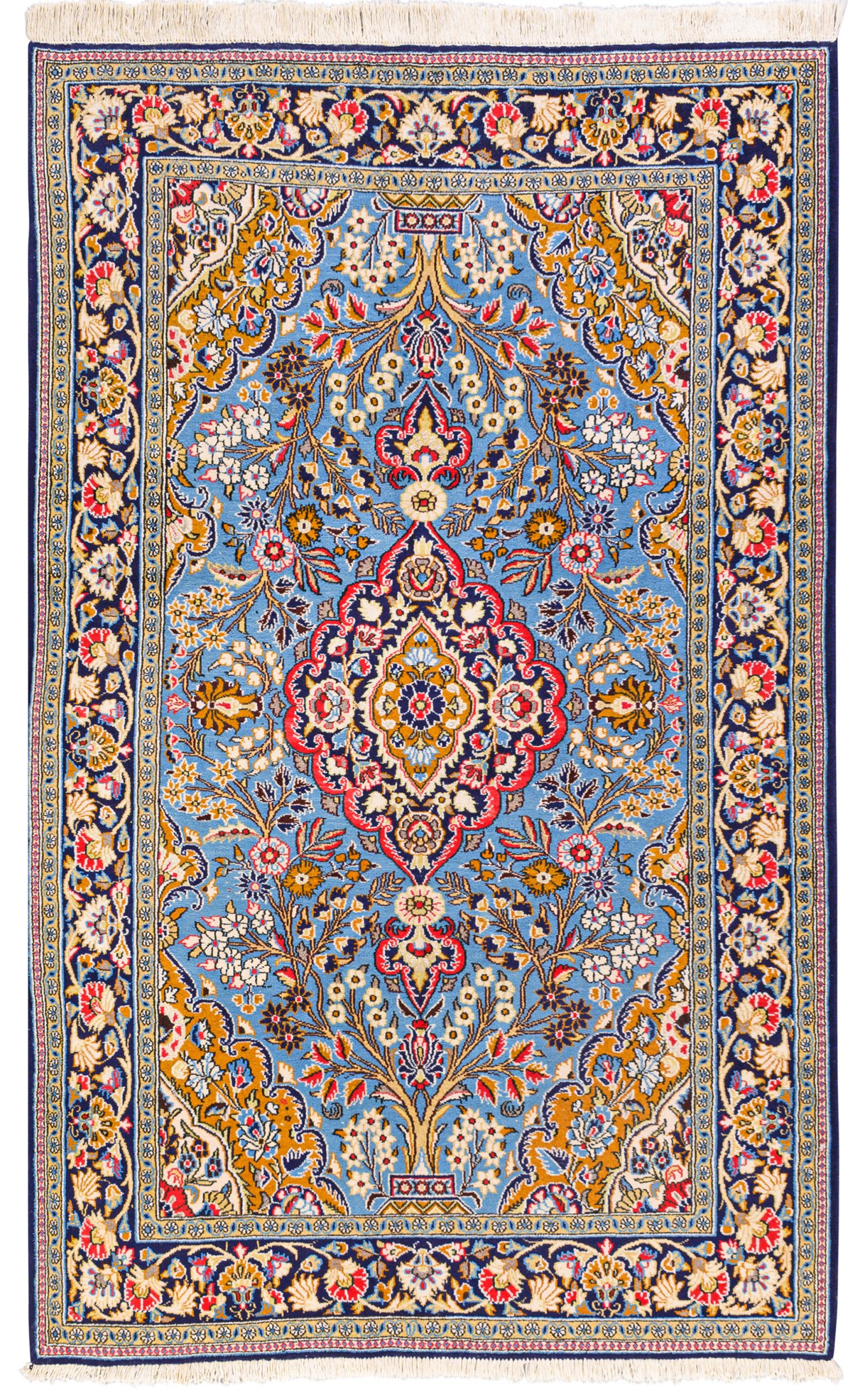 Persien. Wolle auf Baumwolle. Im hellblauen Innenfeld gestrecktes Zentralmedaillon mit Anhängern sowie passig geschweifte Ecklösungen. Flächendeckende Musterung aus Blütenzweigen. Umlaufend dunkelgrundige Hauptbordüre, flankiert von schmalen Bändern. 135 cm x 220 cm.