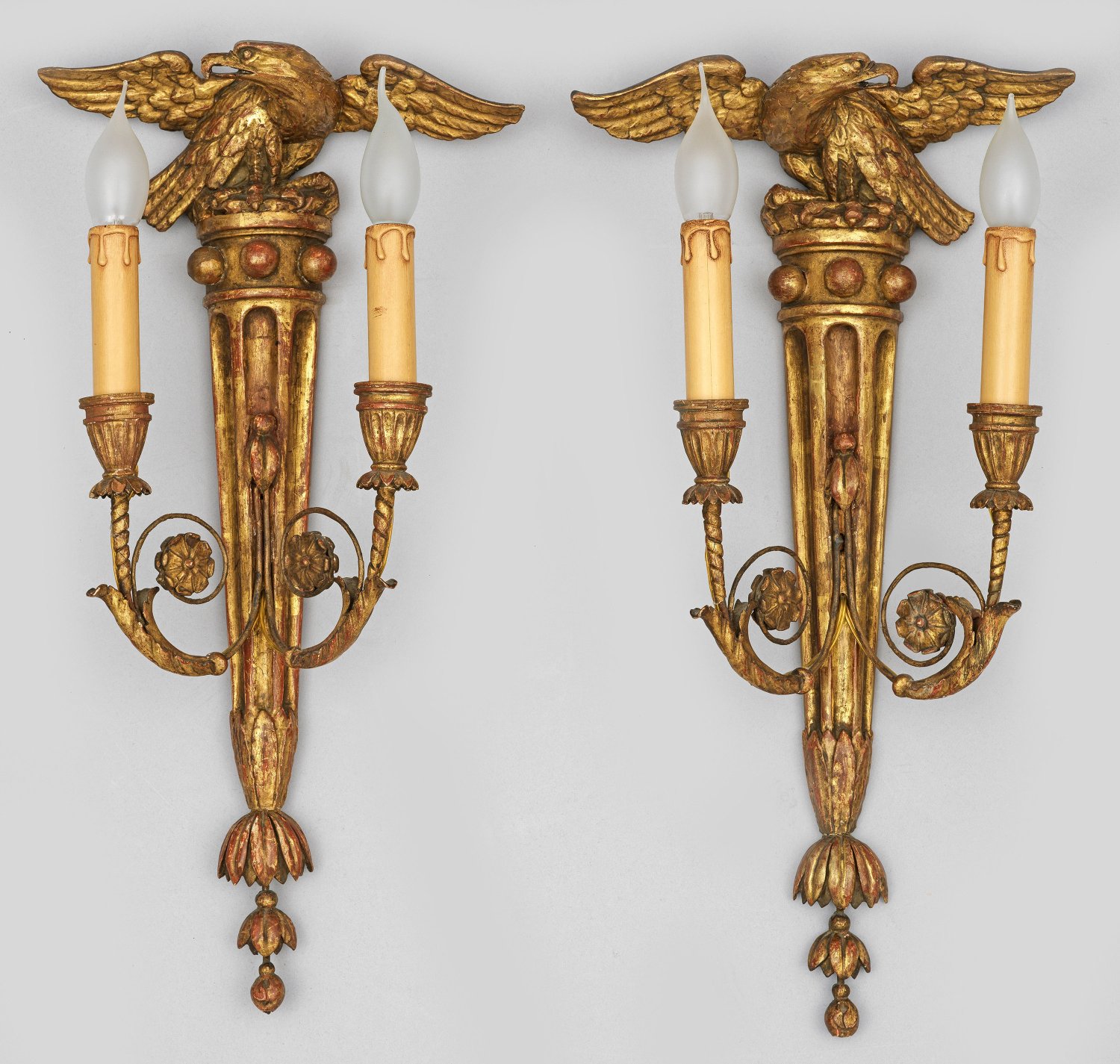 Gegenstücke. 2-flg.; Holz, reliefplastisch geschnitzt sowie Metall, stuckiert, gefasst und vergoldet. Schmales, köcherförmiges, tief kanneliertes Wandschild mit vollplastisch gestalteter Adlerbekrönung. In der Mitte davon ausgehend stark geschwungene Leuchterarme aus eingerollten Voluten mit vasenförmigen Tüllen. Nachträglich elektrifiziert. H. 57 cm.