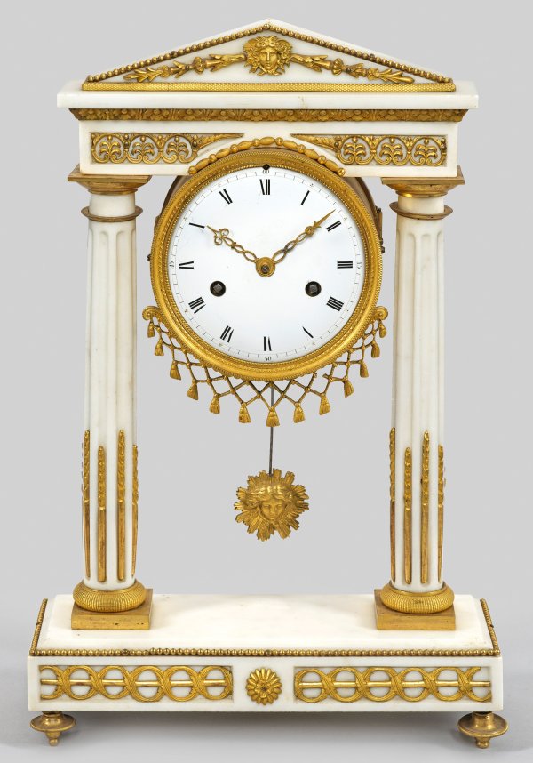 Weißer Marmor und vergoldete Bronze. Über rechteckigem Sockel auf gedrückten Balusterfüßen architektonisch gegliedertes Gehäuse aus kannelierten Vollsäulen und Giebelgesims. Profilgerahmtes, weißes Emailzifferblatt. Pendulenwerk mit Fadenaufhängung sowie Halbstundenschlag auf Glocke. H. 42,5 cm. 28 cm x 9 cm.
