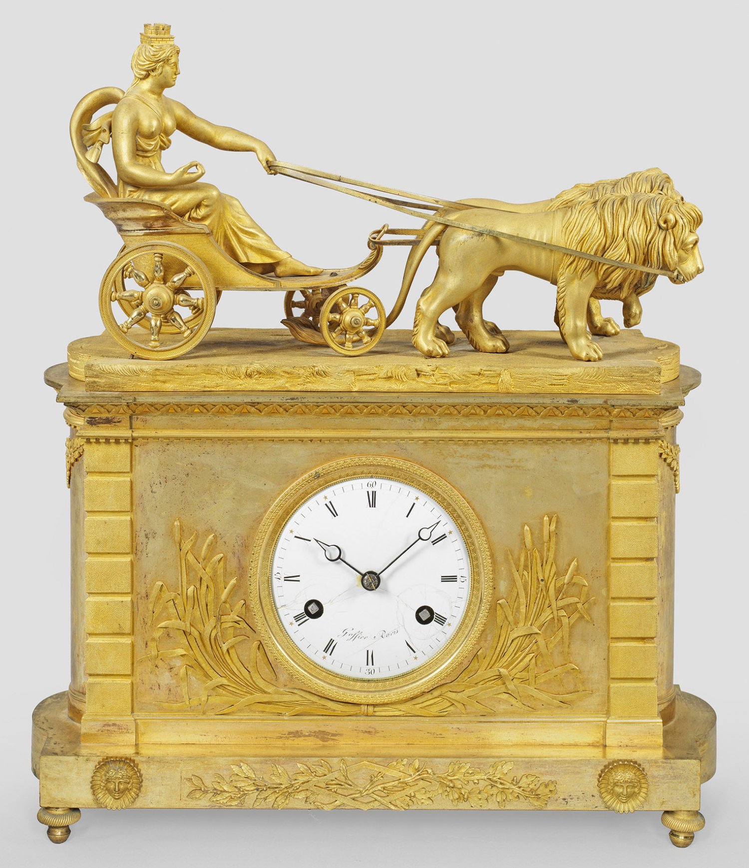Bronze, feuervergoldet. Über flacher Basis und Balusterfüßen hoher, architektonisch gegliederter Podestsockel in Form einer Stadtmauer. In der Front profilgerahmtes, besch. Emailzifferblatt, bez. Goffier à Paris, umgeben von reliefplastischen Schilfkolben. Oberhalb skulpturale Bekrönung in Gestalt der antiken Gottesmutter Kybele mit Krone in einem von Löwen gezogenen Streitwagen. Pendulenwerk mit Fadenaufhängung sowie Halbstundenschlag auf Glocke. H. 44 cm. 40 cm x 13 cm.