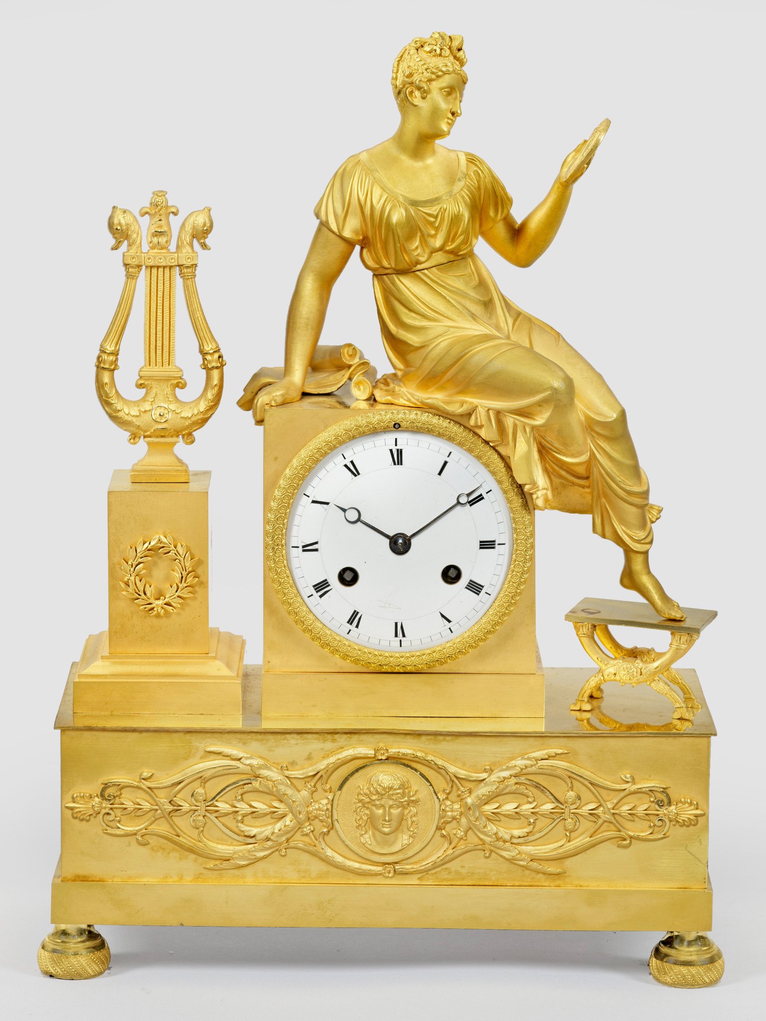 Bronze, vergoldet. Über querrechteckig angelegtem Sockel vollplastische Darstellung einer allegorischen Figur, auf dem rechteckigen Uhrengehäuse sitzend. Daneben große Lyra. Profilgerahmtes Emailzifferblatt. Pendulenwerk mit Fadenaufhängung sowie Halbstundenschlag auf Glocke. H. 37,5 cm. 27 cm x 11 cm.