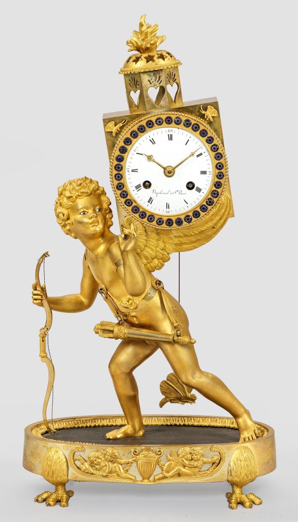 Bronze, feuervergoldet und Emaille. Vollplastische Darstellung eines voranschreitenden Amorknabens mit eingesetzten Augen, auf seinen Schwingen eine Laterna magica tragend. Als Sinnbild für das im wahrsten Sinne des Wortes Voraugenführen der verrinnenden Zeit findet sich anstelle des Schaukastens das unw. besch. Emaillezifferblatt, bez. Raphanel à St. Omer, eine Symbolik, die durch den Zeigegestus Amors unterstützt wird. Pendulenwerk mit Fadenaufhängung sowie Halbstundenschlag auf Glocke. Unterhalb ovale Plinthe auf Klauenfüßen. H. 46 cm.