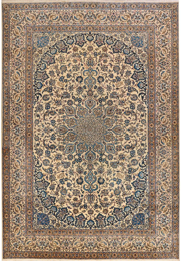 Persien. Korkwolle mit Seide auf Baumwolle. Feine Knüpfung. Im cremefarbenen Innenfeld großes Zentralmedaillon, umlaufend mit Palmettenanhängern sowie breite, korrespondierende Ecklösungen. Flächendeckend dichte Musterung aus Palmettenranken. Umlaufend breite, korrespondierende Hauptbordüre, flankiert von ornamentierten Bändern. 325 cm x 464 cm.