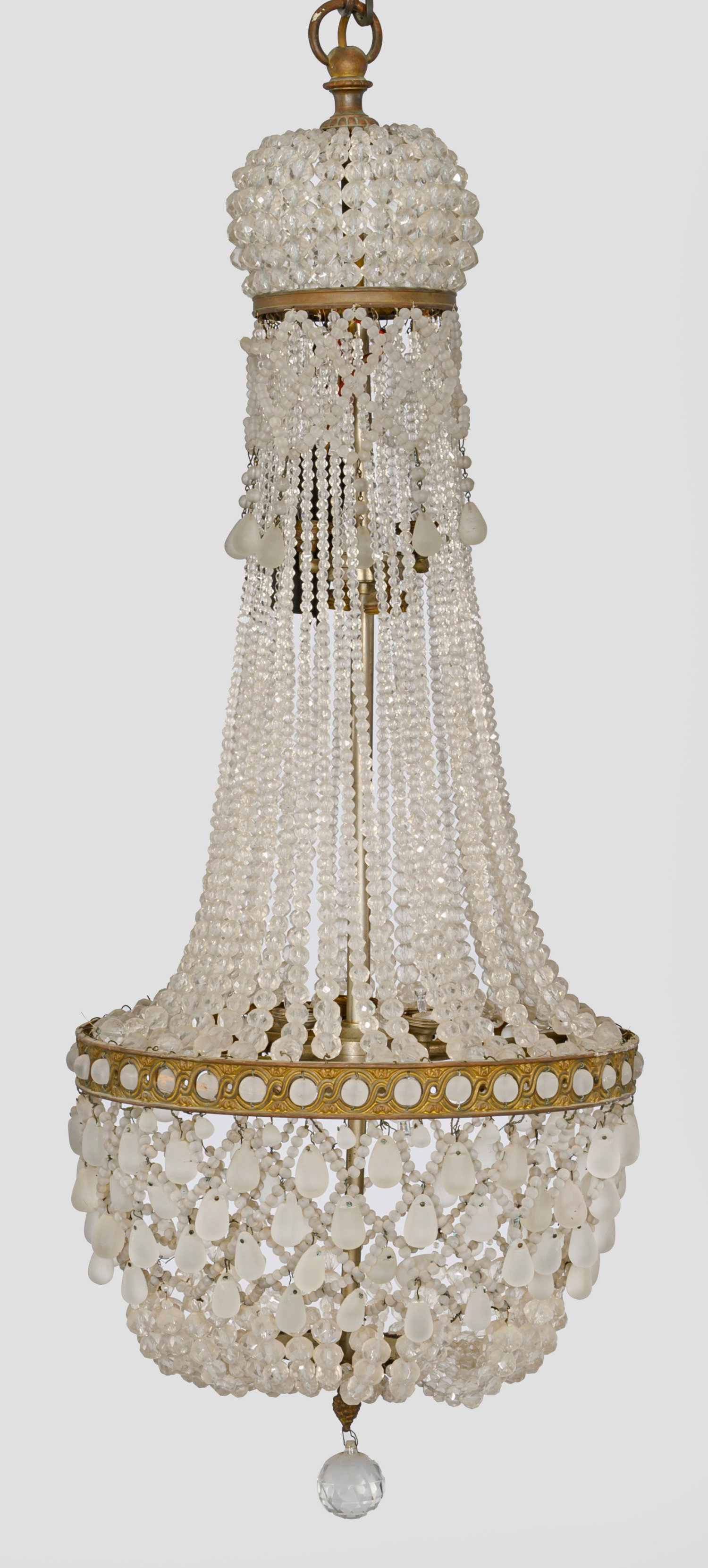 Messing und farbloses, teilw. satiniertes Glas. Balusterförmiger Korpus aus teilw. gitterartig angelegten Prismenschnüren und schmalem Reif aus Wellenband und Kugelelementen. Kuppelförmiger oberer Abschluss. Innen zehn Lampenfassungen. Elektrifiziert. Fehlstellen. H. 95 cm. D. 40 cm.