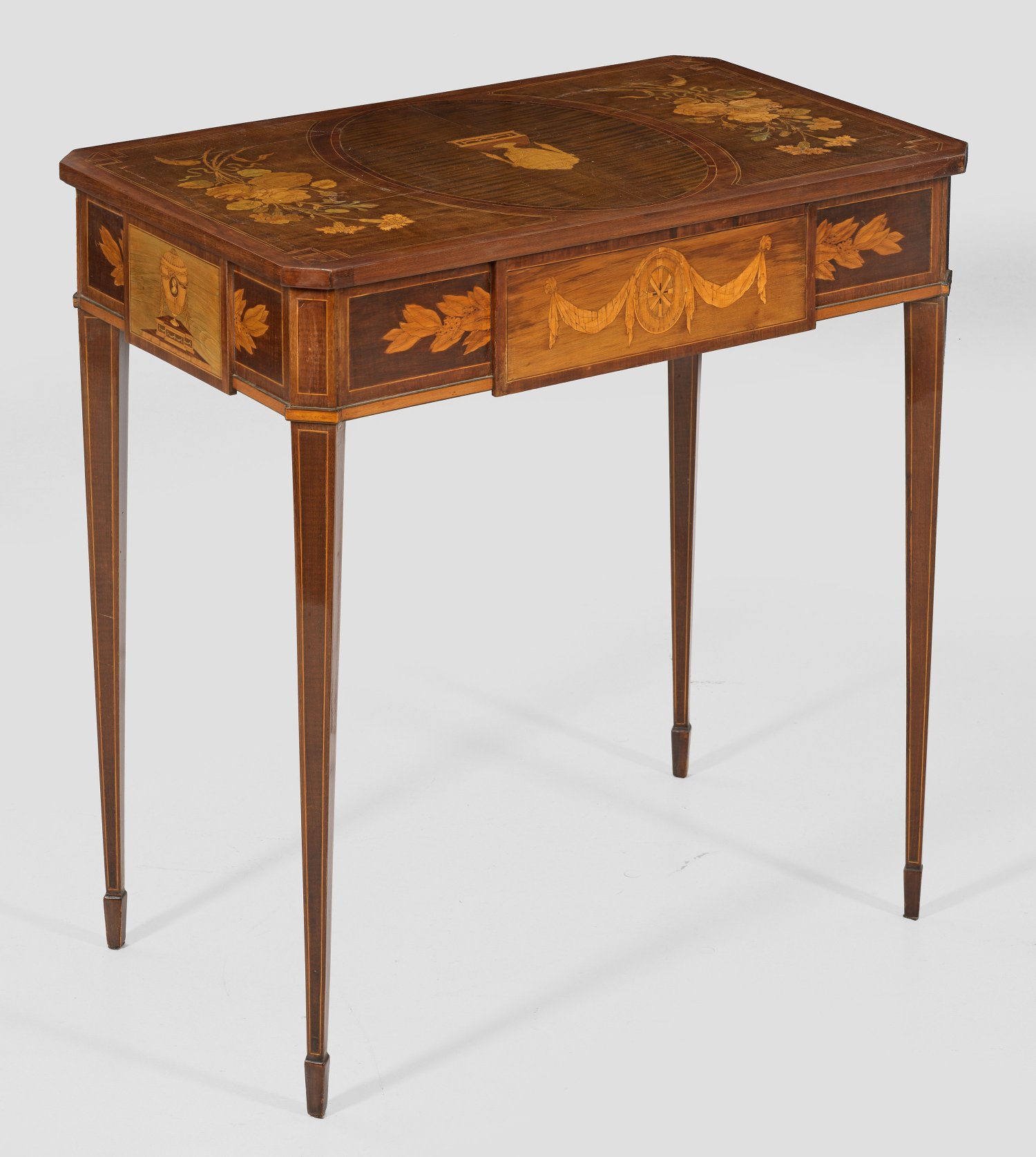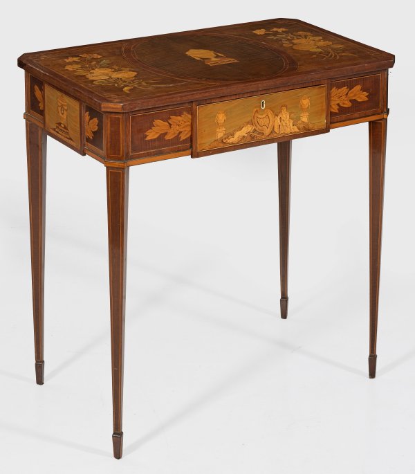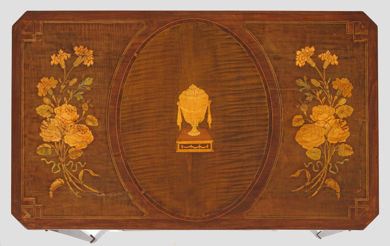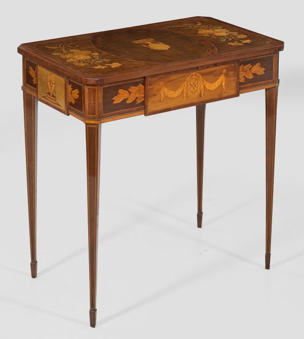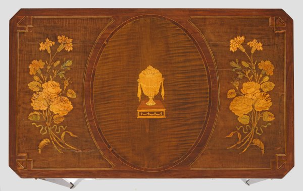 Mahagoni, Amaranth und Riegelahorn, furniert sowie Einlagen aus unterschiedlichen, teilw. grün gefärbten Edelhölzern. Gerader Zargenkasten, allseitig mit rechteckigen, leicht vorkragenden Reserven sowie schräggestellten Ecken auf hohen, konischen Vierkantbeinen. In der gegliederten Front drei Schubladen unterschiedlicher Größe, teilw. mit verdecktem Federmechanismus. Gering überstehende Deckplatte. Allseitig detailreiche, teils szenisch angelegte Intarsien sowie Vasenmotive und aufwändige Blüteneinlagen. H. 75 cm. 74 cm x 44 cm.