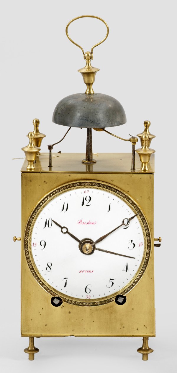 Messing. Hochrechteckiges Gehäuse auf schlanken Balusterfüßen. Profilgerahmtes Emailzifferblatt, bez. Boiston Nevers. Mechanisches Werk mit Ankerhemmung. Halbstunden-Rechenschlagwerk, Repetition und Weckfunktion. Freistehende Glocke als oberer Abschluss mit aufstellbarem Rundbügel. H. 29 cm. 11,5 cm x 7,5 cm.