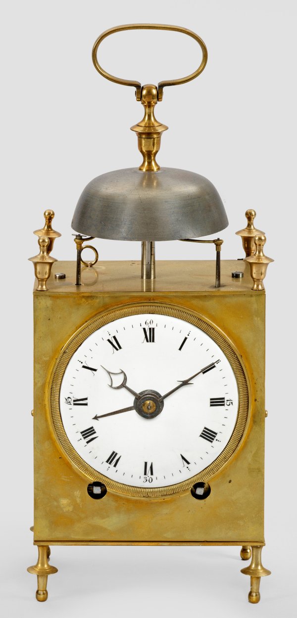 Messing. Hochrechteckiges Gehäuse auf schlanken Balusterfüßen. Profilgerahmtes, weißes Emailzifferblatt. Mechanisches Werk mit Scherenhemmung. Halbstunden-Rechenschlagwerk, Repetition und Weckfunktion. Freistehende Glocke als oberer Abschluss mit aufstellbarem Rundbügel. H. 31 cm. 12,5 cm x 8 cm.