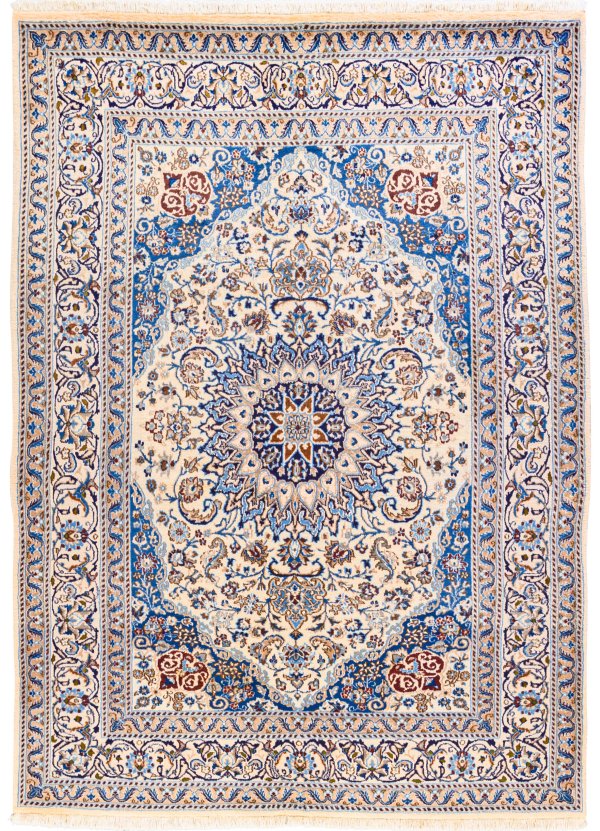 Persien. Wolle mit Seide auf Baumwolle. Im elfenbeinfarbenen Innenfeld großes Zentralmedaillon mit Hellblau sowie passig geschweifte Ecklösungen. Flächendeckende Musterung aus Palmettenranken. Umlaufend beigefarbene Bordüre mit dichter Rankenmusterung, flankiert von beigefarbenen Bändern. 195 cm x 272 cm.