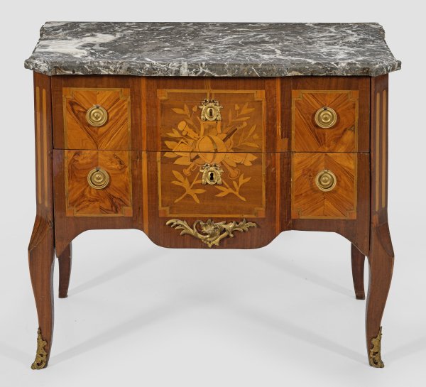 Mahagoni und Rosenholz, furniert sowie Einlagen aus unterschiedlichen Hölzern. Gerader, querrechteckig angelegter Korpus, flankiert von schräggestellten Ecklisenen, in geschwungene Beine übergehend. In der gegliederten Front zwei optisch verbundene Schubladen sans traverse sowie minimal gewölbter Mittelrisalit. Flächendeckend breit gerahmte, gespiegelt angeordnete Furnierfelder sowie schauseitig intarsierte Attribute der Musik. Schlagstempel-Signatur. G.JANSEN (wird Meister 1767) sowie Pariser Jury-Stempel JME. Deckplatte aus graugemasertem Marmor. Erg.; H. 81 cm. 96 cm x 49 cm.