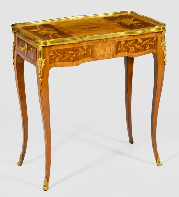 Rosenholz, furniert sowie Einlagen aus unterschiedlichen Edelhölzern. Gerader, leicht ausgebogter Zargenkasten in der Front mit ausziehbarer Schreibfläche sowie seitlich je eine Schublade auf hohen, geschweiften, konisch verlaufenden Beinen. Gering überstehende, profilgerahmte Deckplatte. Allseitig breit gerahmte Furnierfelder mit eingelegten Vasen- und Köchermotiven sowie Blütenzweigen, von Fadeneinlagen begrenzt. Applikationen aus vergoldeter Bronze. H. 71 cm. 64 cm x 38 cm.
