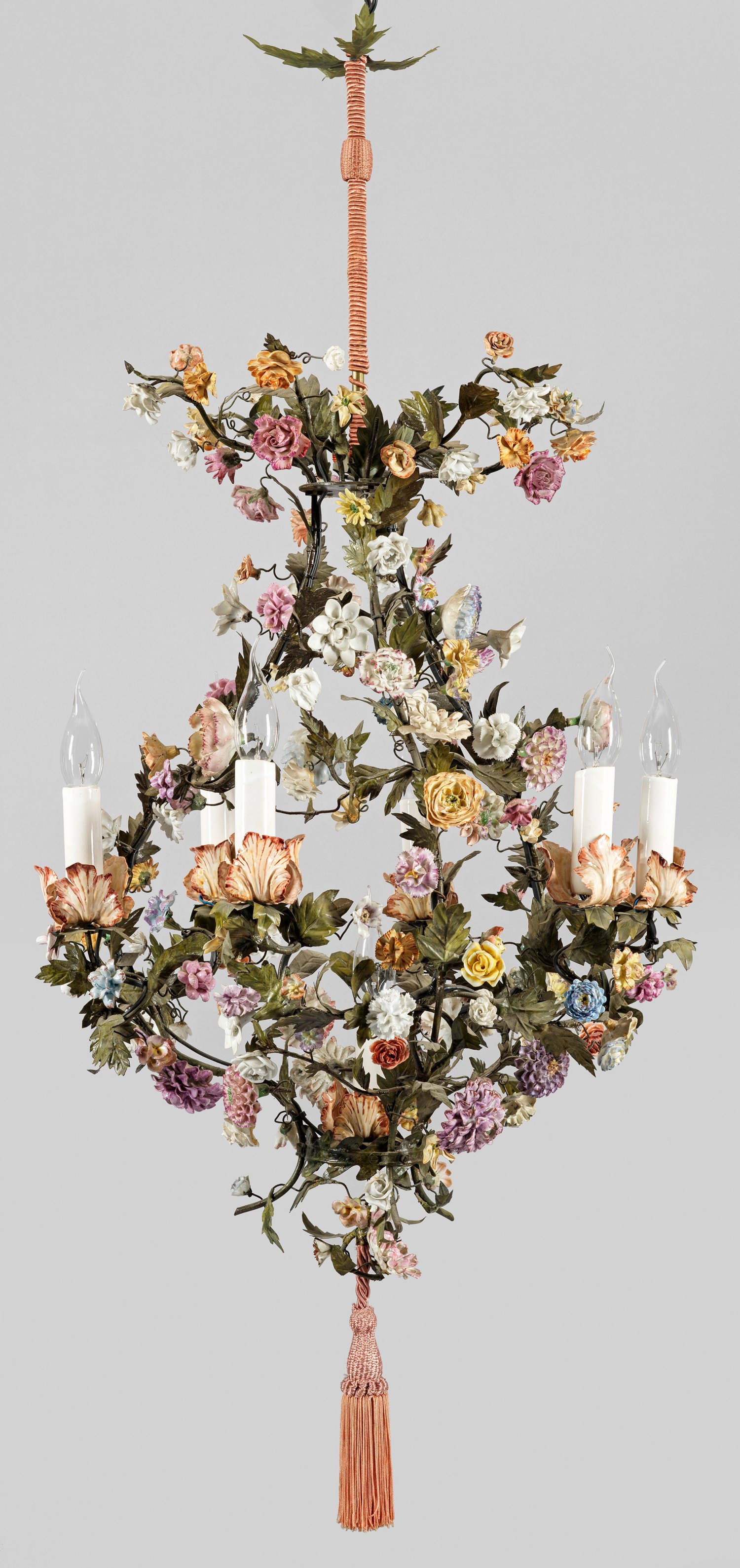 7-flg.; Farbig staffiertes Metall, Biskuitporzellan und polychrom bemalte Porzellanblüten. Offen gestalteter, balusterförmiger Korpus aus stark geschwungenen Stäben als Träger. Daran reicher Dekor aus aufsteigend verzweigtem Astwerk mit einer Vielzahl unterschiedlicher sog. Vincennes-Blüten sowie kelchförmigen Blütentüllen für die Leuchtmittel. Oberhalb bekrönender Blattkranz. Unterhalb Abschluss mit anmodellierter Stoffquaste. Reste alter Elektrifizierung. Partiell best.; Minim. rest.; Ges.-H. ca. 130 cm.