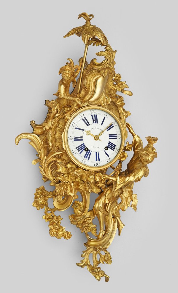 Bronze, vergoldet. Balusterförmiger, asymmetrisch angelegter, teilw. skulptural gestalteter Korpus aus üppigen Rocaillen, Voluten und Blüten. Vollplastische Darstellung einer jungen Dame im asiatischen Kostüm, das Gehäuse emporsteigend. Korrespondierender oberer Abschluss aus einer entsprechend kostümierten Meerkatze mit Palmenschirm. Profilverglastes Emailzifferblatt mit römischen und arabischen Zahlen, bez. Etienne Le Noir à Paris. Pendulenwerk mit Fadenaufhängung sowie Halbstundenschlag auf Glocke. Platine ebenfalls bez. Etienne Le Noir Paris. Rest.; H. 95 cm.