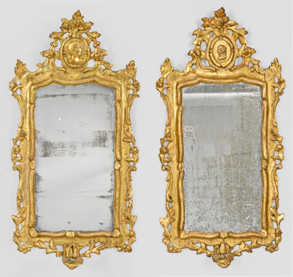 1-flg.; Holz, geschnitzt, gefasst und vergoldet. Hochrechteckige Spiegelrahmung aus gestreckten Blattvoluten. Leicht vorkragende, durchbrochen gearbeitete Bekrönung mit zentralem Porträtmedaillon, umgeben von Blüten. Korrespondierender unterer Abschluss mit geschwungenem Leuchterarm. Altes Spiegelglas. 88 cm x 43 cm.