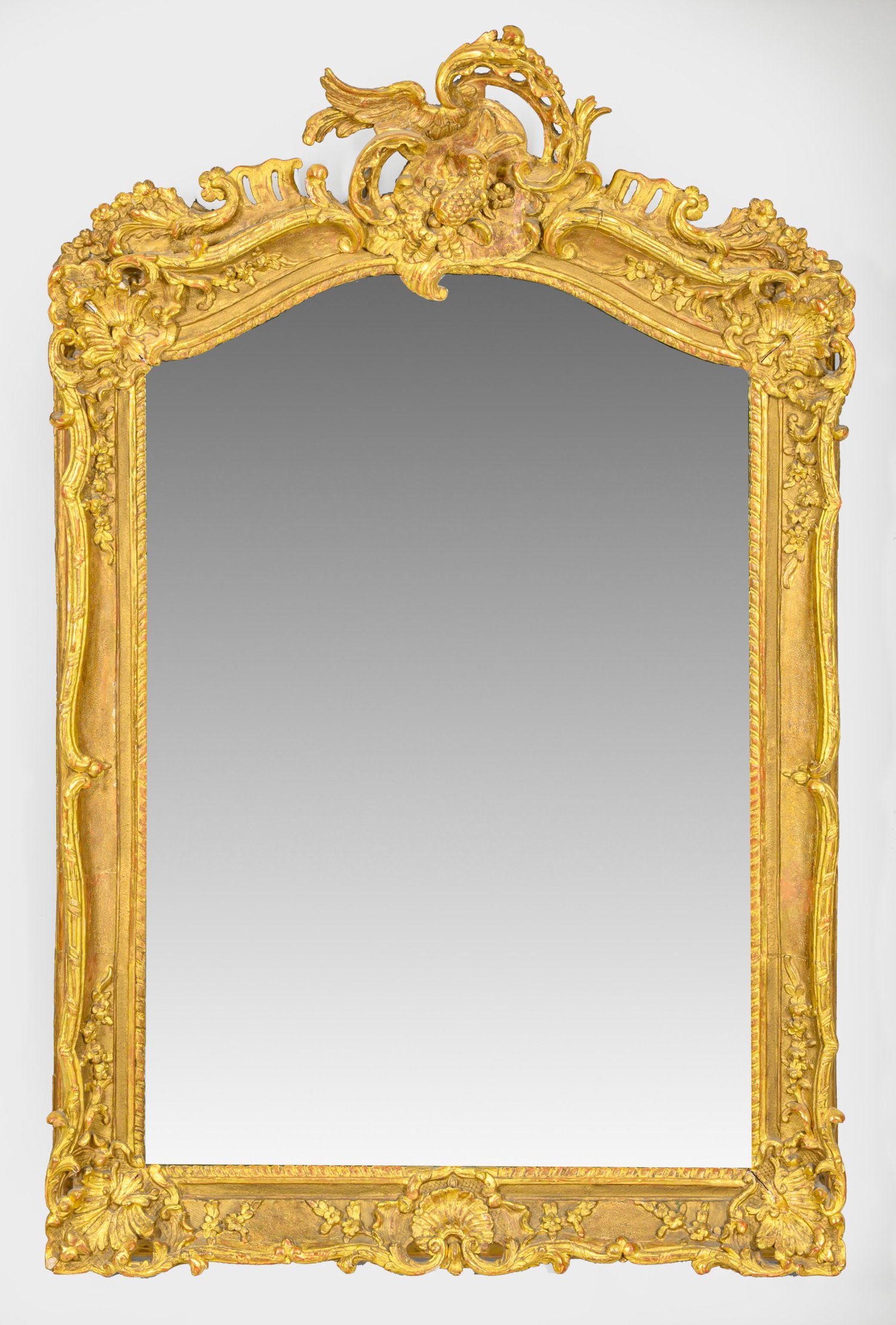 Holz, geschnitzt, gefasst und vergoldet. Hochrechteckige, leicht gekehlte Spiegelrahmung mit reliefplastischen Blüten und Muschelwerk, begrenzt von gestreckten Voluten mit geschweift ansteigendem oberen Abschluss. In der Mitte, durchbrochen gearbeitete, asymmetrisch gestaltete Bekrönung in Form einer üppigen Rocaillekartusche. 144 cm x 94 cm.