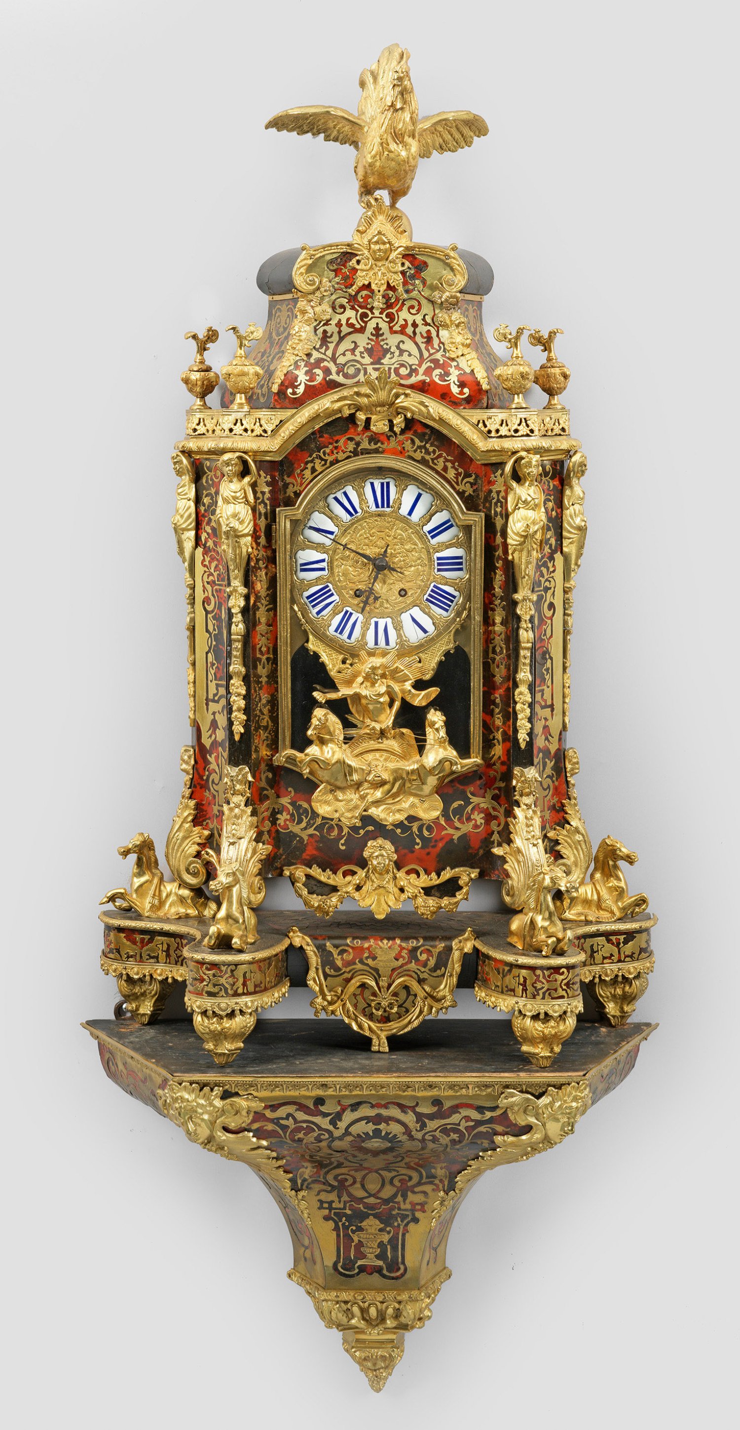 Flächendeckender Fond aus rot hinterlegtem Lack und ornamentiertem Messing in sog. Boulle-Technik. Über kräftigen Balusterfüßen und konkav eingezogener Sockelplatte hohes, eintürig verglastes, auf plastischen Pferden ruhendes Uhrengehäuse mit Balusterbekrönungen sowie geschweift ansteigendem oberen Abschluss mit vollplastischer Bekrönung in Gestalt eines Hahnes. Reliefiertes Zifferblatt aus Emailreserven, bez. Dupressoir A Paris. Pendulenwerk mit Pendelfeder sowie Schlagwerk auf Glocke. Unterhalb korrespondierende Konsole. Ges.-H. 146 cm. 63 cm x 28 cm.