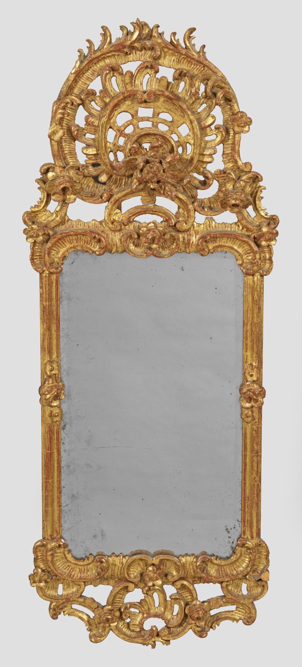 Holz, geschnitzt, gefasst und vergoldet. Hochrechteckige, profilierte Spiegelrahmung mit oberem Abschluss aus Rocaillespangen. Hohe, geschweift ansteigende und durchbrochen gearbeitete Bekrönung aus üppigem Gitter- und Muschelwerk und plastischen Blüten sowie korrespondierender unterer Abschluss. Facettiertes Spiegelglas. 109 cm x 42 cm.