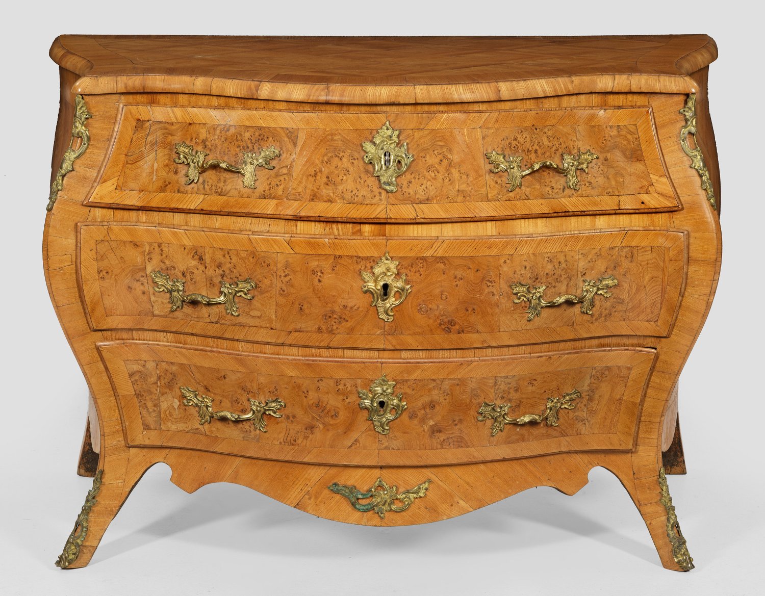 Kirschbaum, furniert sowie teilw. Einlagen aus Nussbaum. Dreiseitig bombierter Korpus, flankiert von weit ausgezogenen Ecklisenen, in ausgestellte Beine übergehend. In der gegliederten Front drei breite Schubladen. Gering überstehende, korrespondierende Deckplatte. Flächendeckend breit gerahmte Furnierfelder aus Rautenmarketerie, teilw. von großen Rautenrahmen und schmalen Fadeneinlagen begrenzt. H. 82 cm. 101 cm x 55 cm.