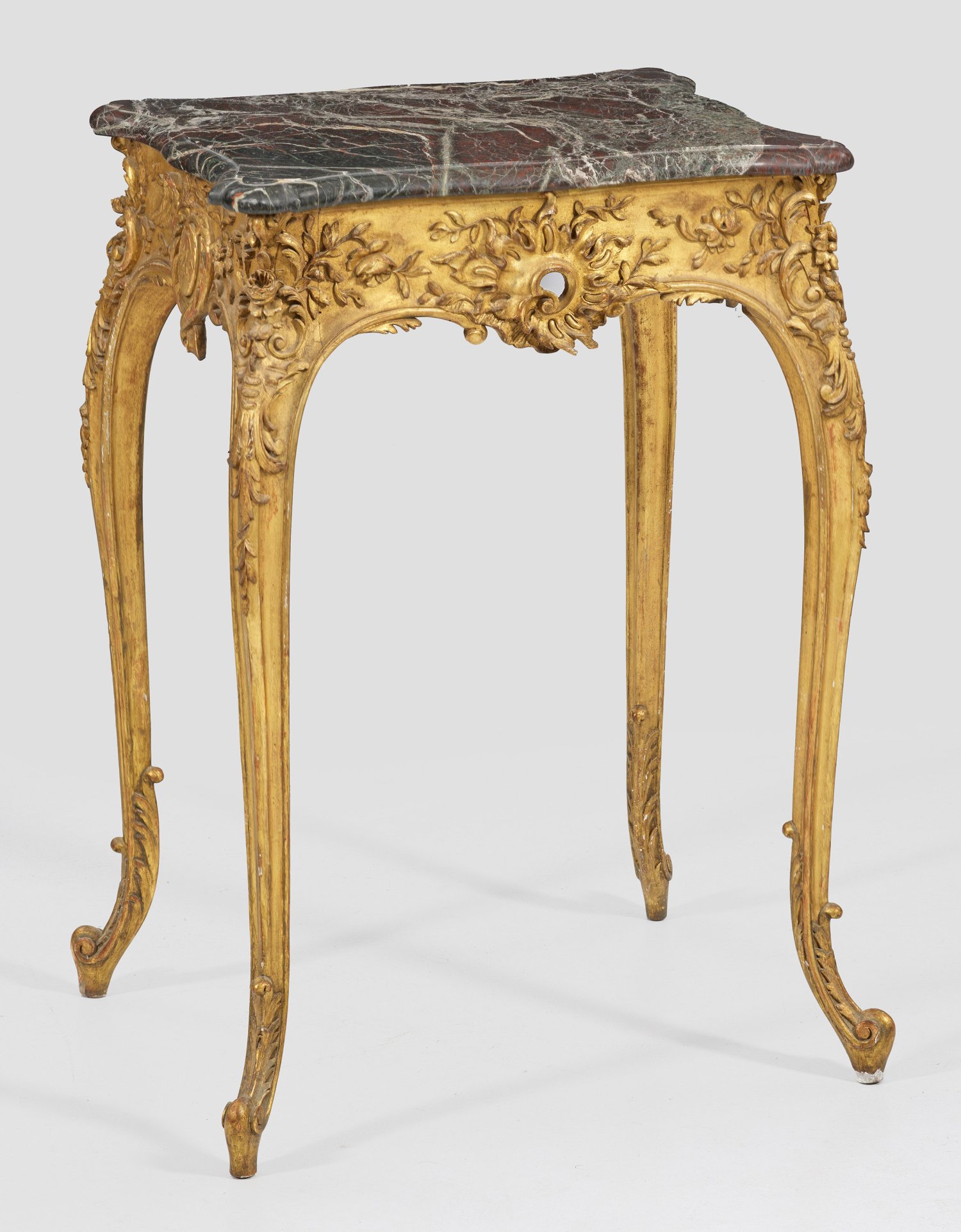 Holz, geschnitzt, gefasst und vergoldet. Passig geschweifte Zarge mit erhaben reliefierten Sonnenmotiven, Blattwerk und plastischen Blüten auf hohen, geschwungenen Beinen. Korrespondierende Deckplatte aus dunkelgrün, bordeauxrot und weiß gemasertem Marmor. H. 78 cm. 53 cm x 40 cm.