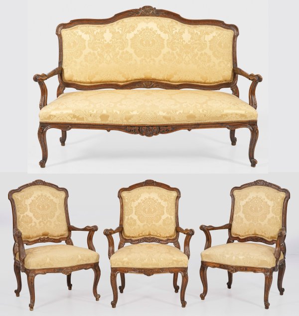 4-tlg.; Sofa und drei Armlehnstühle. Nussbaum, reliefplastisch geschnitzt und dunkel gebeizt. Bombierte Zarge auf geschwungenen Volutenbeinen. Gebogte Stützen für geschweifte Armlehnen. Geschweift ansteigende Rückenlehnen. Gepolstert und bezogen. Sofa-H. 118 cm. 173 cm x 70 cm. Sitz-H. 46 cm.