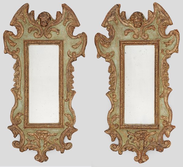 Holz, stuckiert, seegrün gefasst und teilw. vergoldet. Kartuschenförmiges Wandschild aus gegeneinander gestellten Volutenmotiven und Blattwerk. Oberer Abschluss mit plastischem Puttenkopf. In der Mitte hochrechteckige, schmal gerahmte Spiegelfläche. 80 cm x 43 cm.